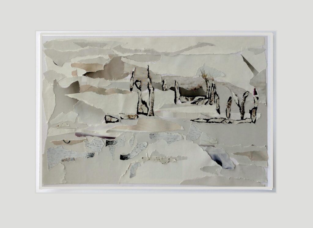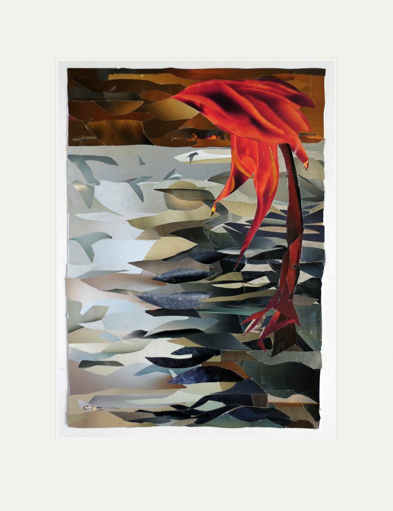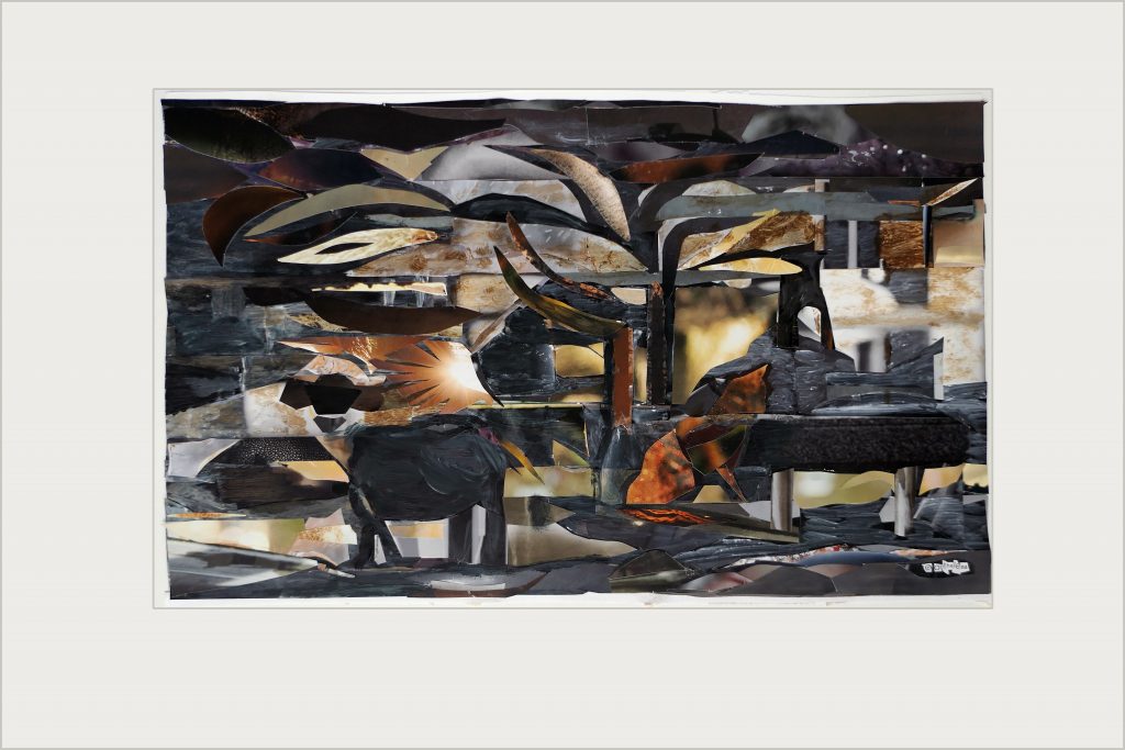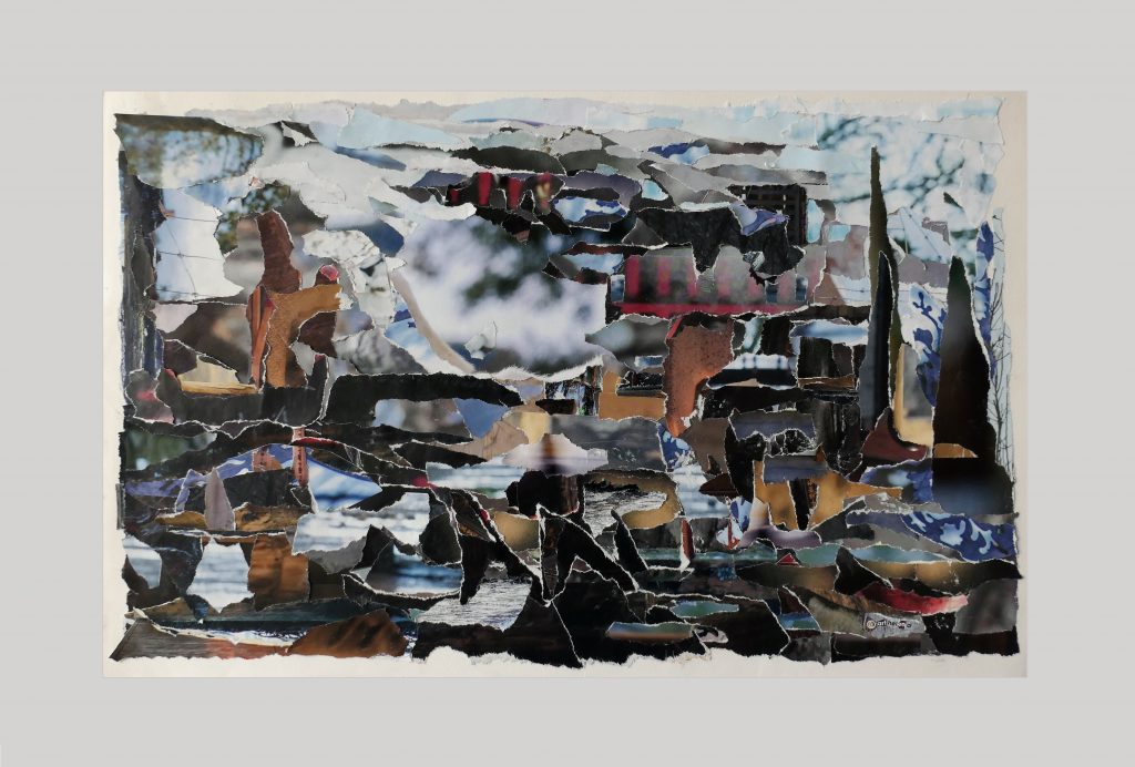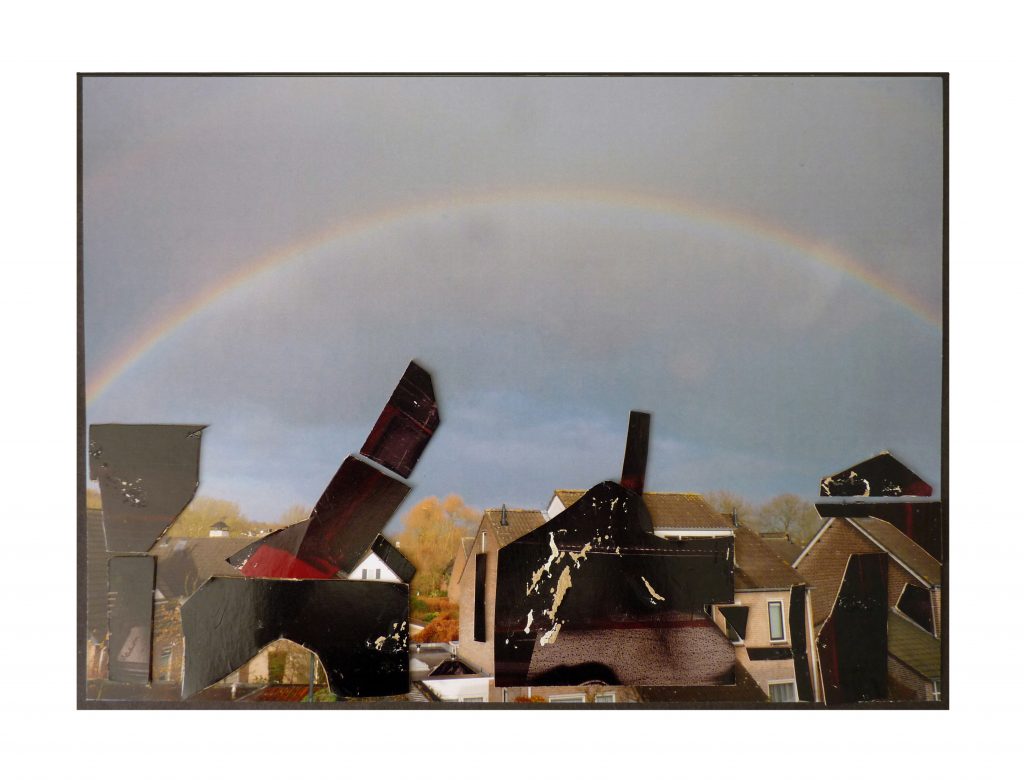 ‘De horizon van morgen’ is gemaakt als collage van gesneden bedrukt karton op een eigen foto. Bij mijn recent werk zijn ook enkele collages over de huidige situatie te zien (WAR en Strategic)