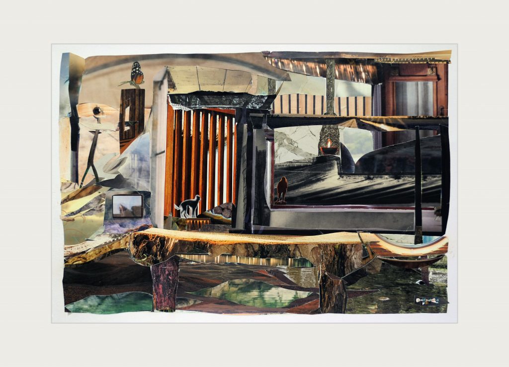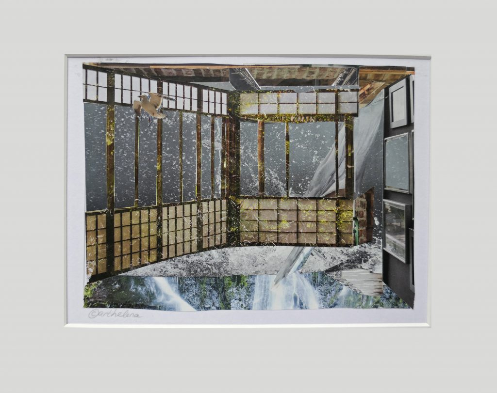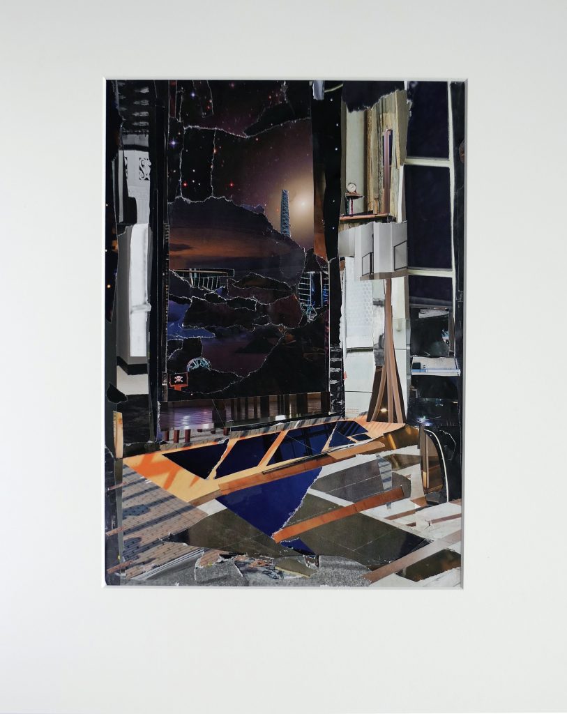 In de collage bevind ik mij in een meditatieve ruimtelijkheid en kijk in verre verten de ruimte van de nacht in, zie sterren en misschien voel ik wel de oneindigheid van het universum. Misschien is binnen en buiten één…?