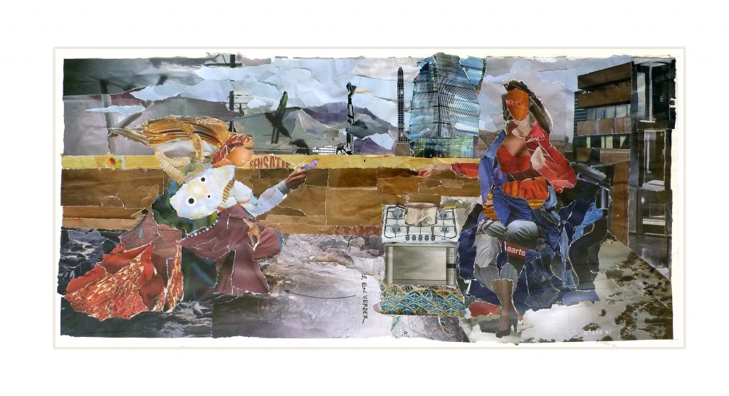 Het was een merkwaardige ontdekking en heel verdrietig ook dat ik zoekend naar de keuze voor deze rubriek stuitte op een werk uit 2014 dat nu wel heel erg actueel is. De collage die ik destijds maakte naar aanleiding van een oorlog  tussen Rusland en Oekraïne. Nu opnieuw een angstwekkend feit en dreiging voor ons allemaal. Wat mij ook bevreemdt is dat de mensheid kennelijk maar weinig leert van voorgaande escalaties en conflicten. Dat men nog steeds niet in staat is in deze tijd van ontwikkeling en beschaving de vrede te bewaren. Daarom zal er ondanks veel moed, doorzettingskracht, liefde en begrip nog veel verandering nodig zijn wil deze ‘horizon van morgen’ nooit meer actueel worden.